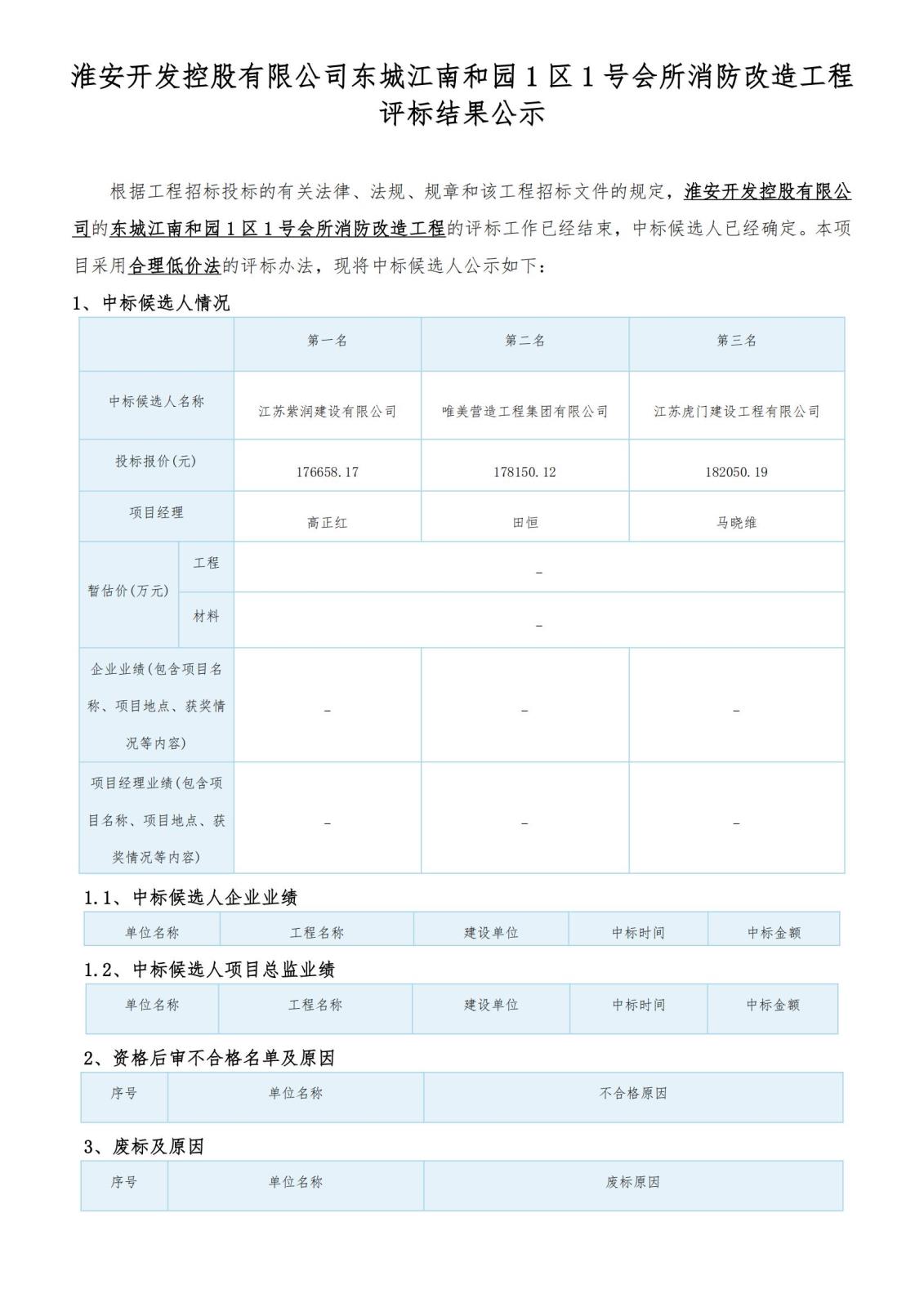 淮安開發控股有限公司東城江南和園1區1號會所消防改造工程 評標結果公示