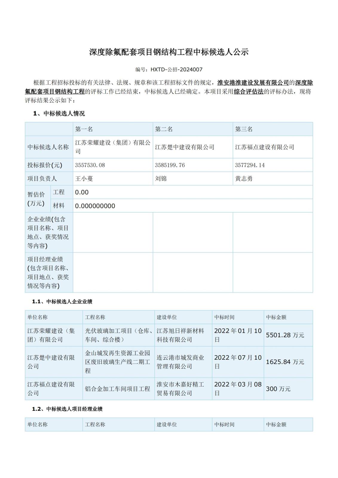 深度除氟配套項目鋼結(jié)構(gòu)工程中標候選人公示